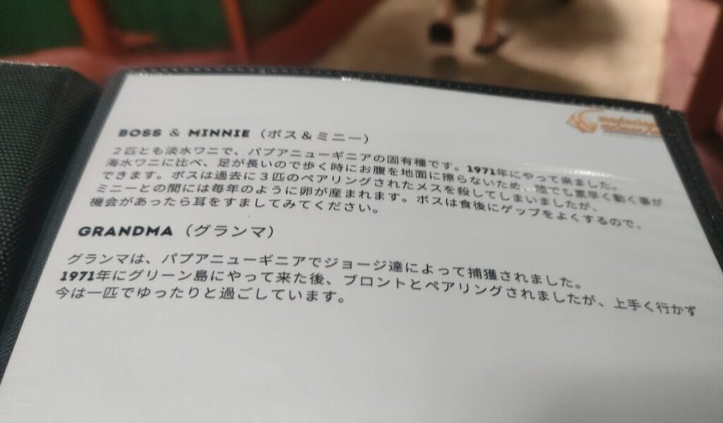 ここにはほかにもワニが何匹かいて、貸してもらった日本語解説書により「ワニ関係」は思ったより複雑らしいことがわかりましたw