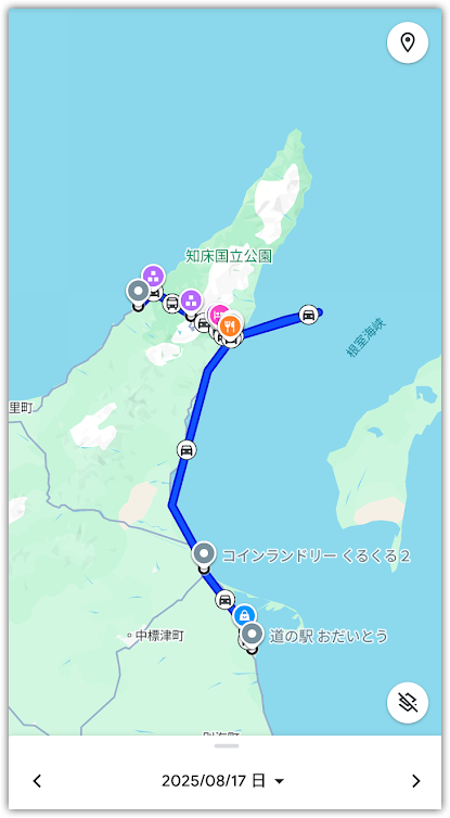 前の地図はなぜかこの日のうちに根室まで行ってて、おかしいなぁと思ってたのですが、そんなことない感じで^^;
