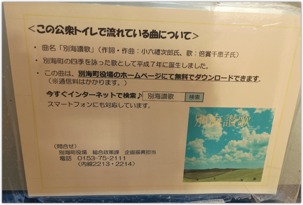 トイレには夜中でも入ると『別海讃歌』という曲が流れます。