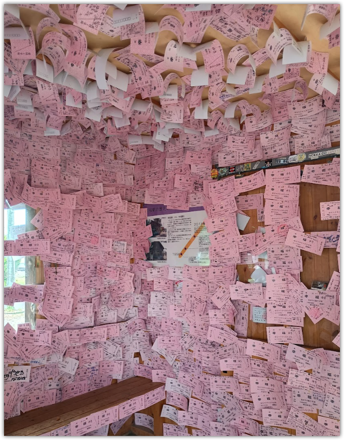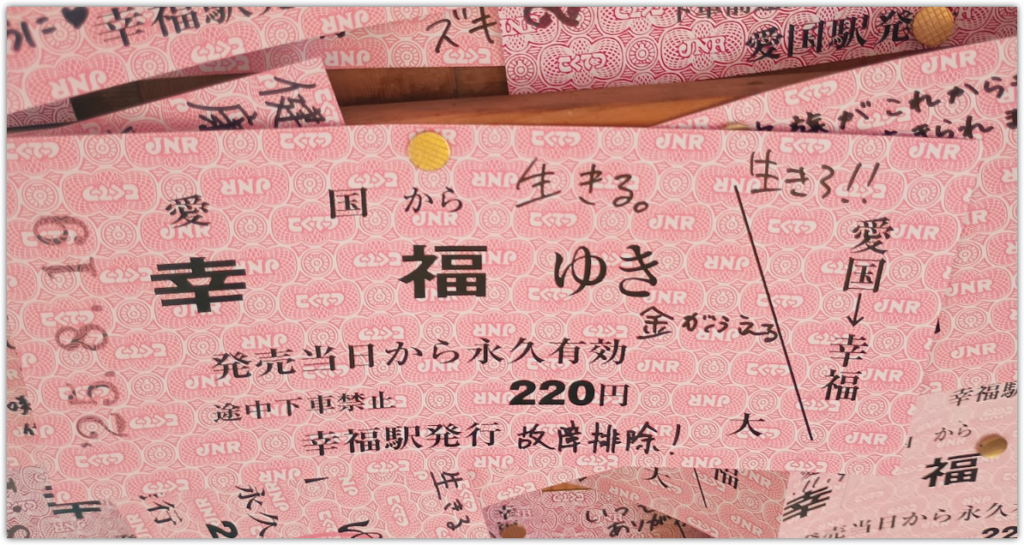 ↓幸福駅の切符を買って、駅舎に貼り付けるのが流行ってるみたい。